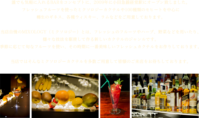 誰でも気軽に入れるBARをコンセプトに、2009年に小田急線経堂駅にオープン致しました。フレッシュフルーツを使ったミクソロジーカクテルや100種類のモヒートを中心に樽生のギネス、各種ウィスキー、ラムなどをご用意しております。